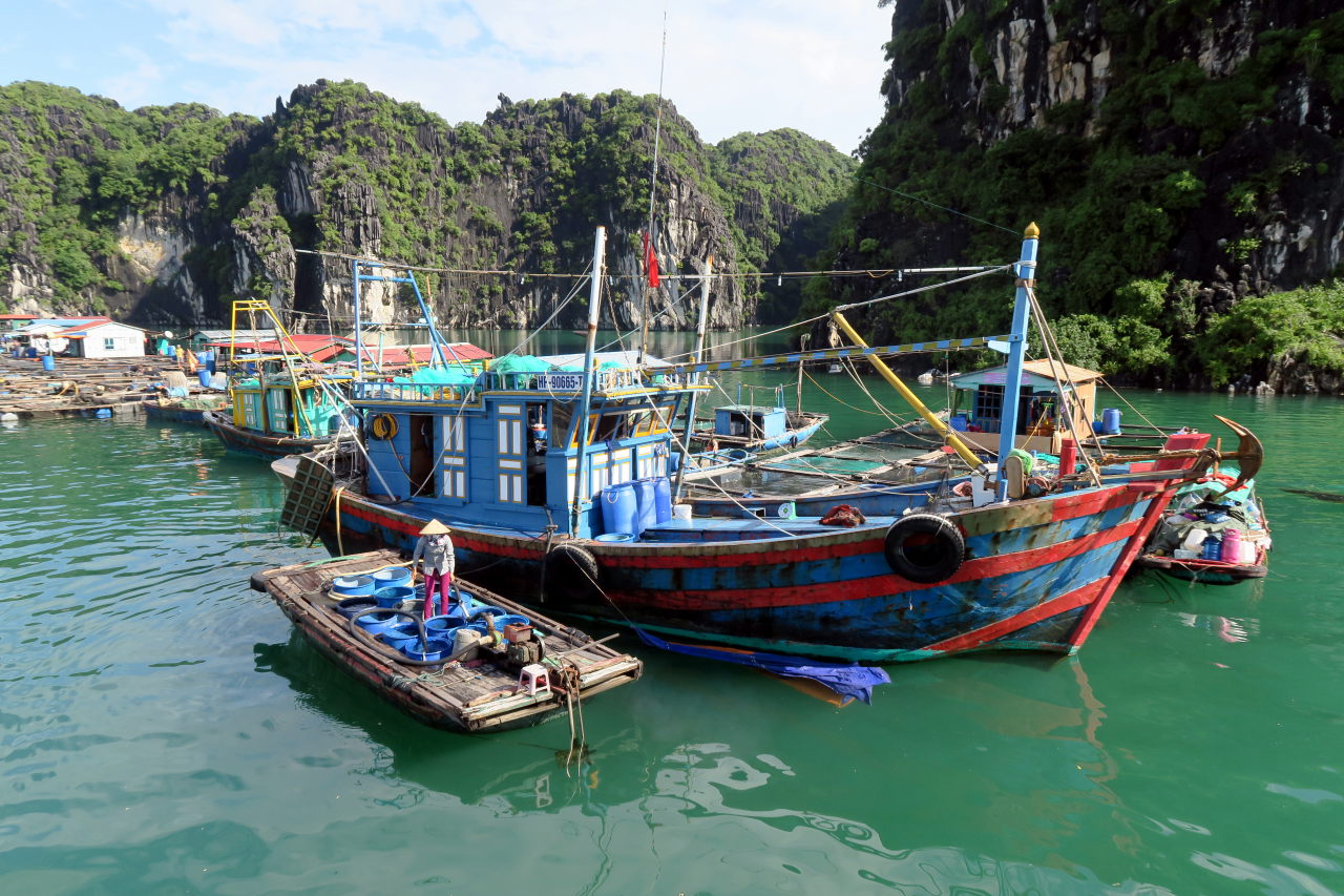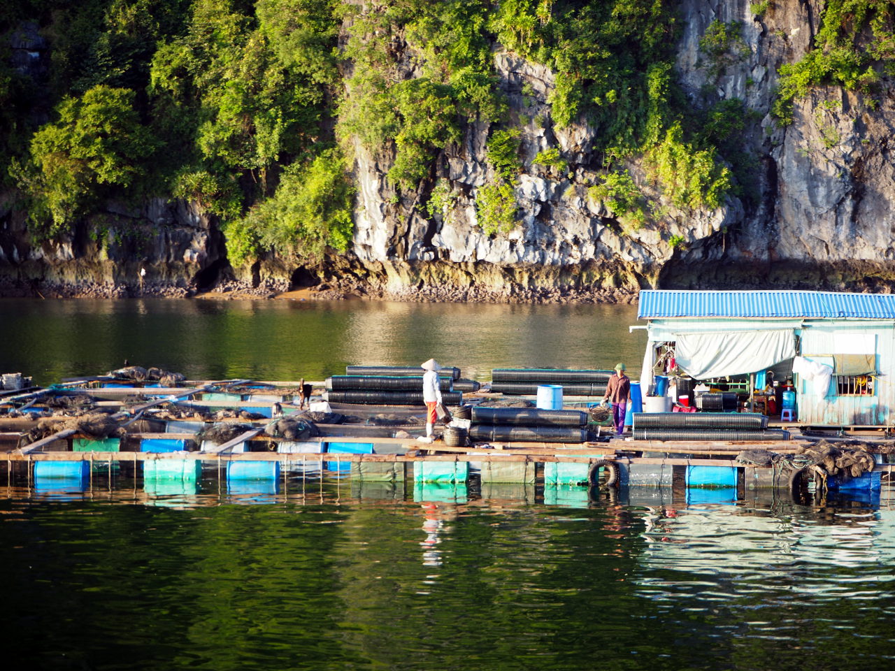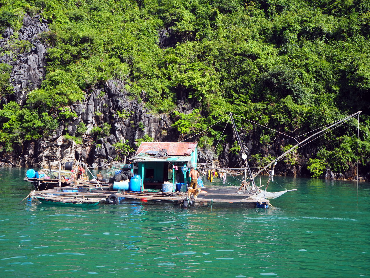 Une maison flottante. De nombreux éleveurs de poisson vivent littéralement dans la baie