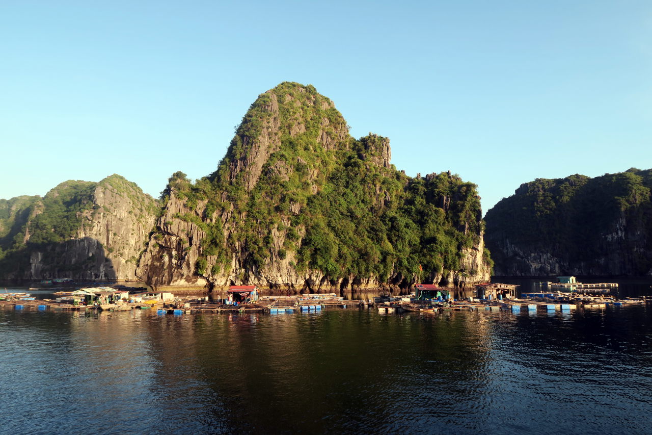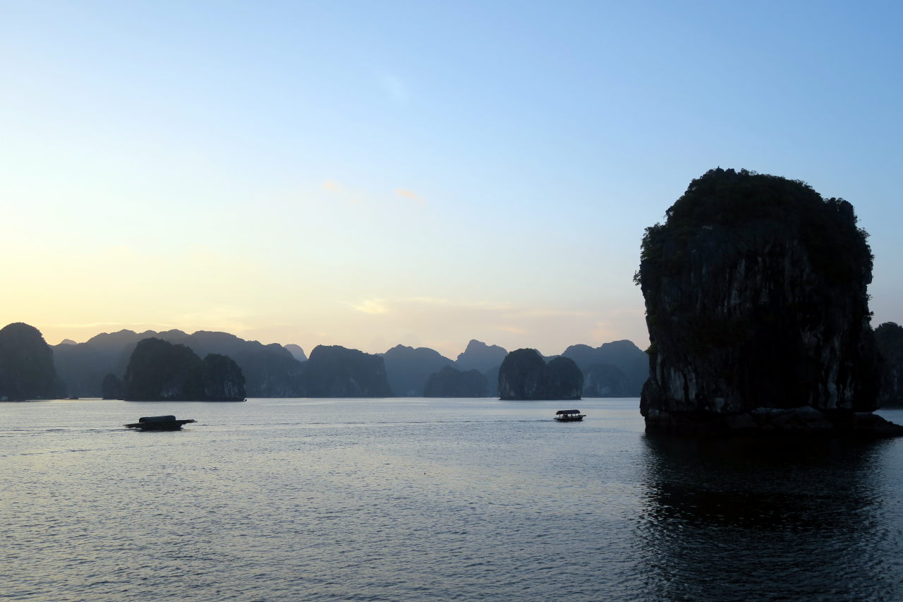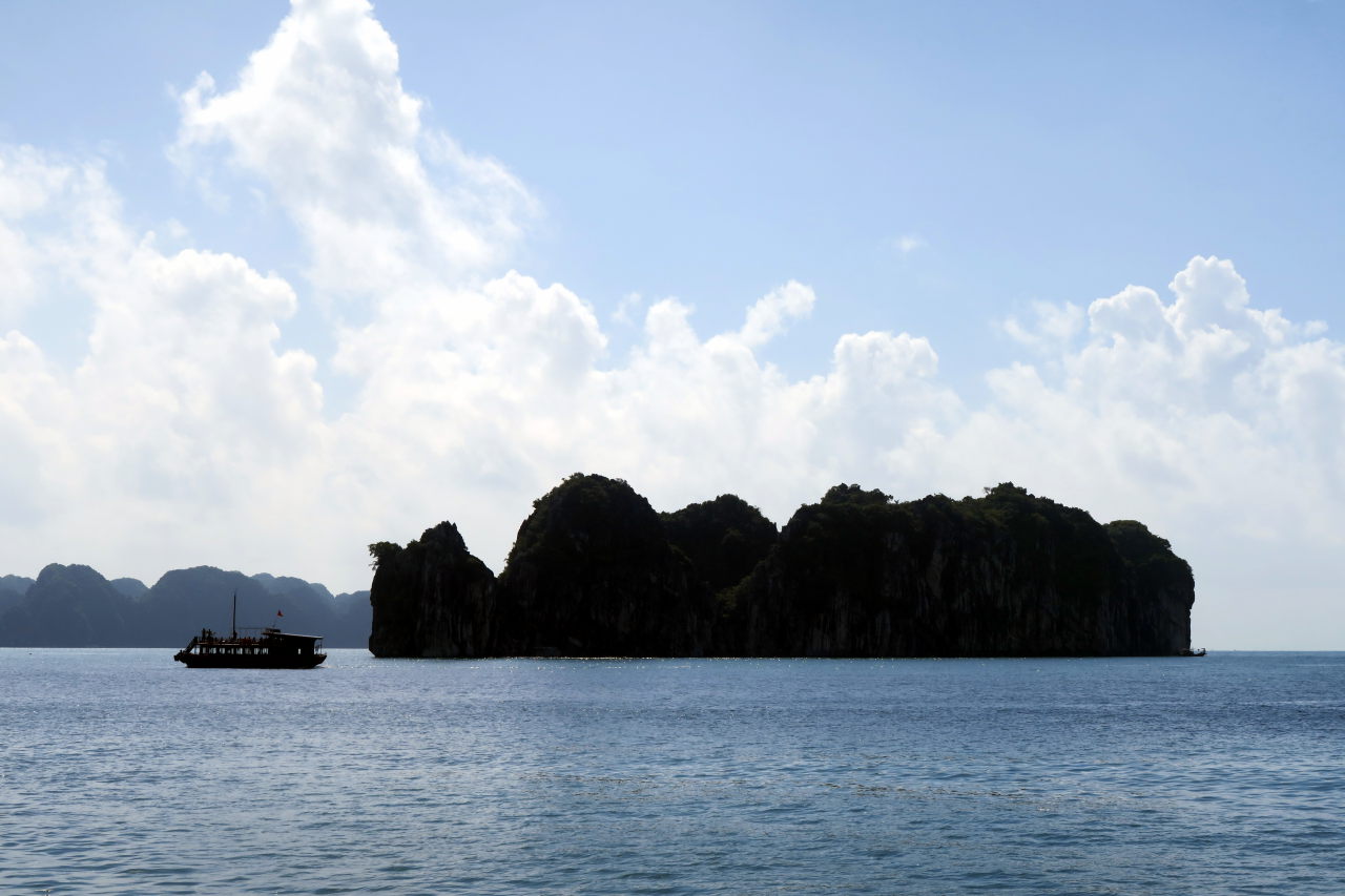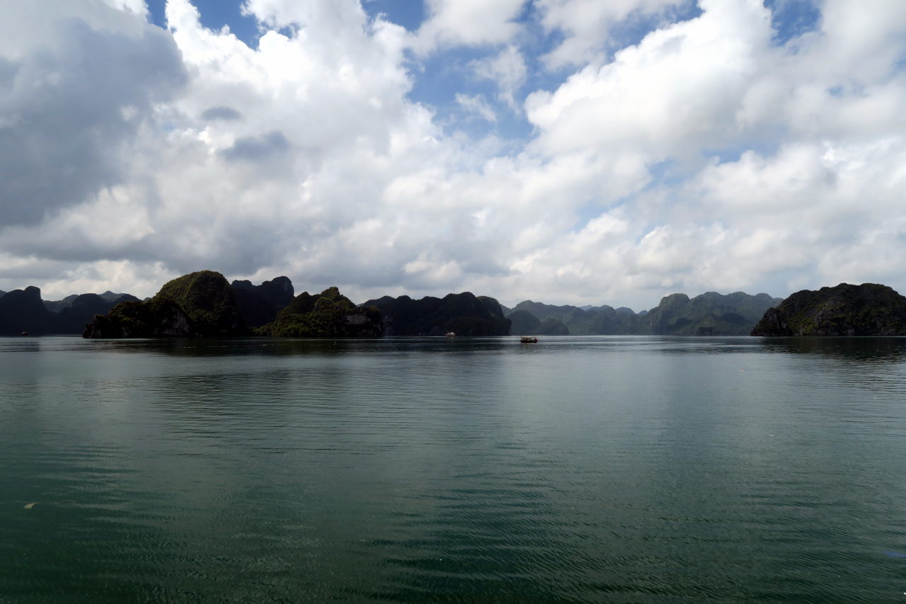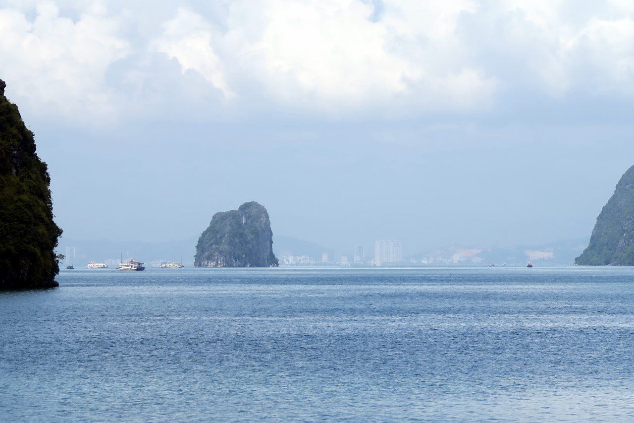 Arrivé dans la baie d’Halong, on distingue au loin les immeubles qui bordent la baie