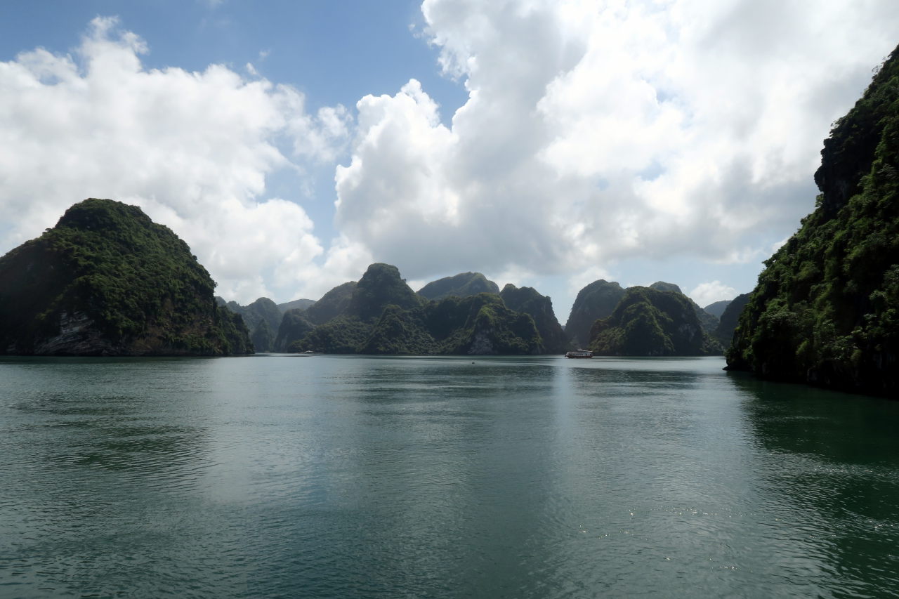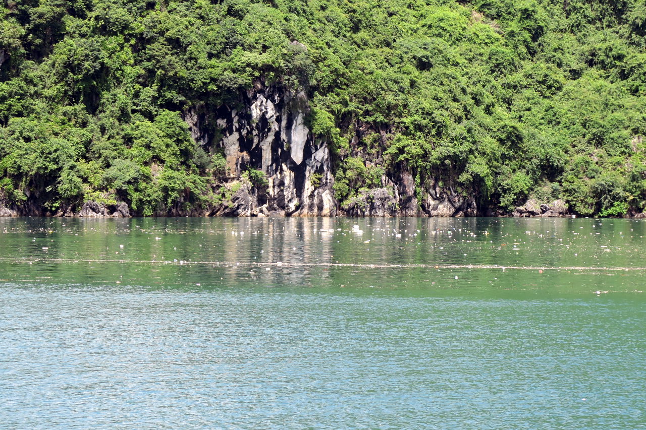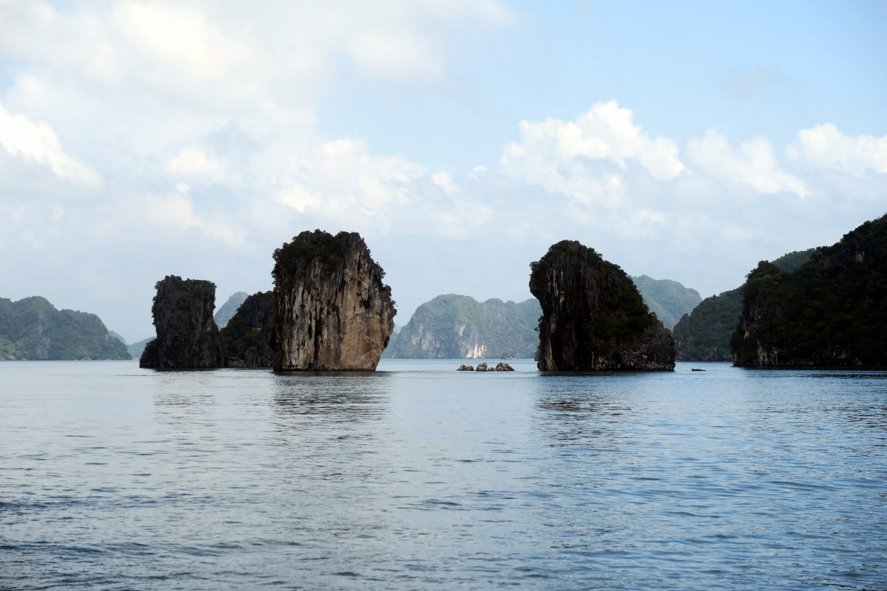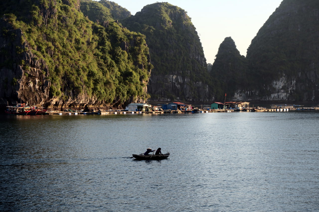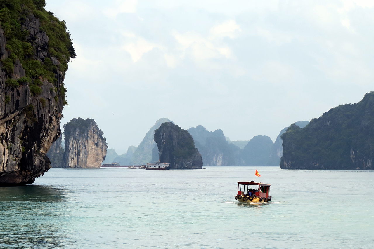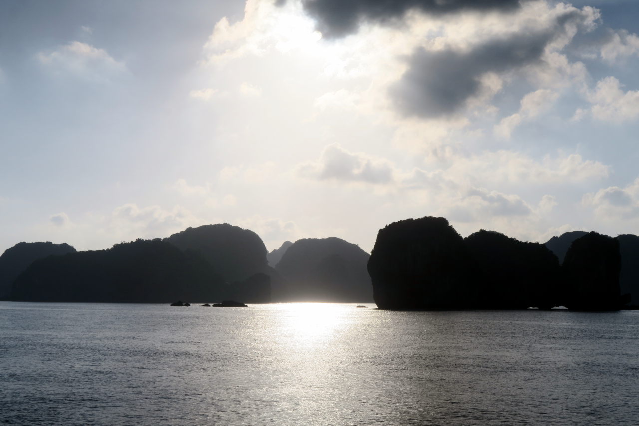 Arrivé dans la baie d’Halong, on distingue au loin les immeubles qui bordent la baie