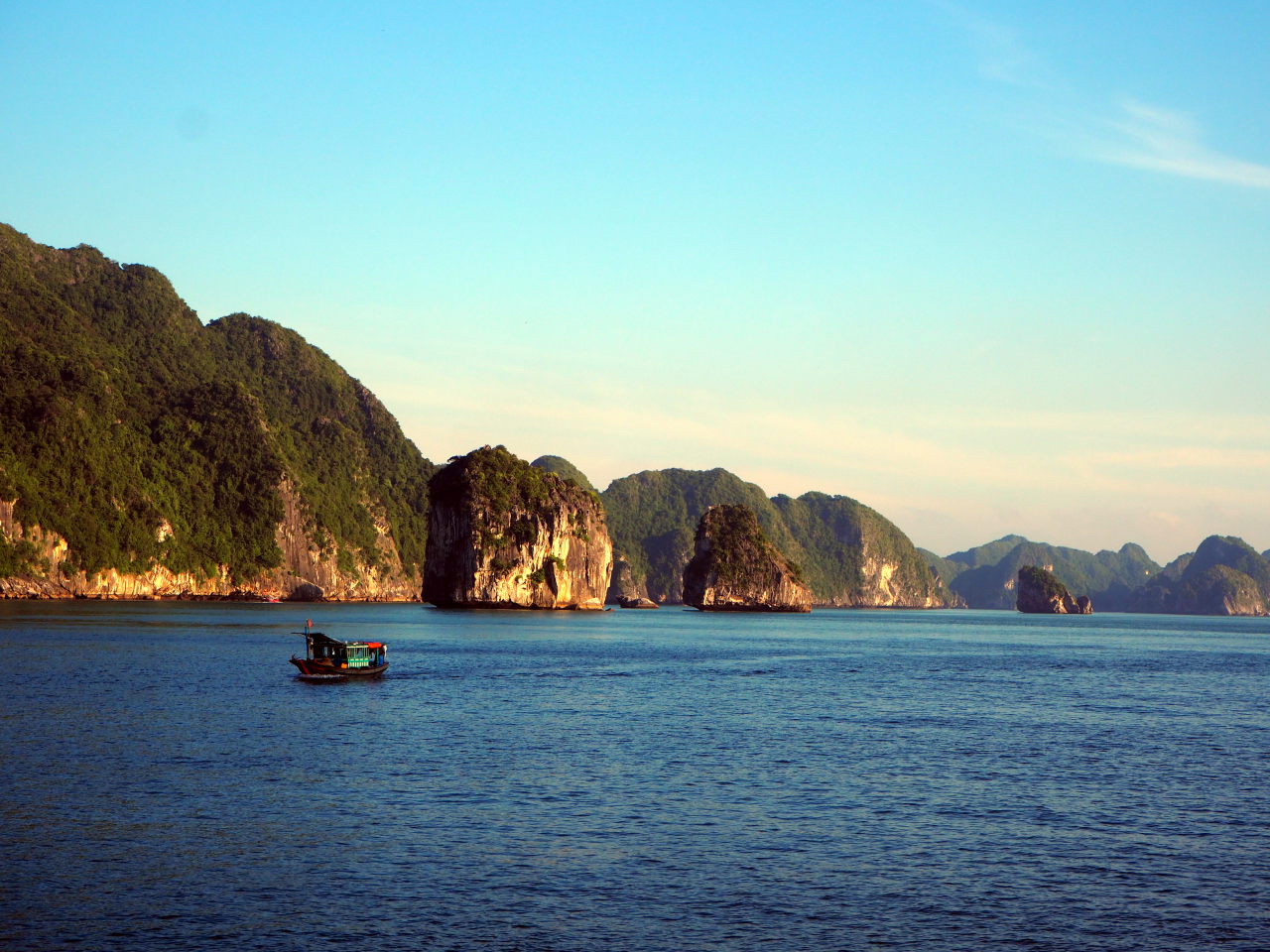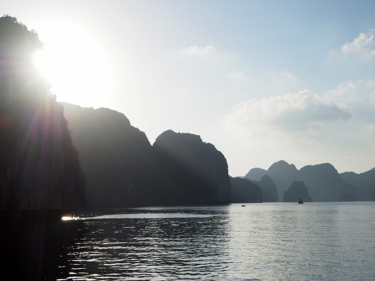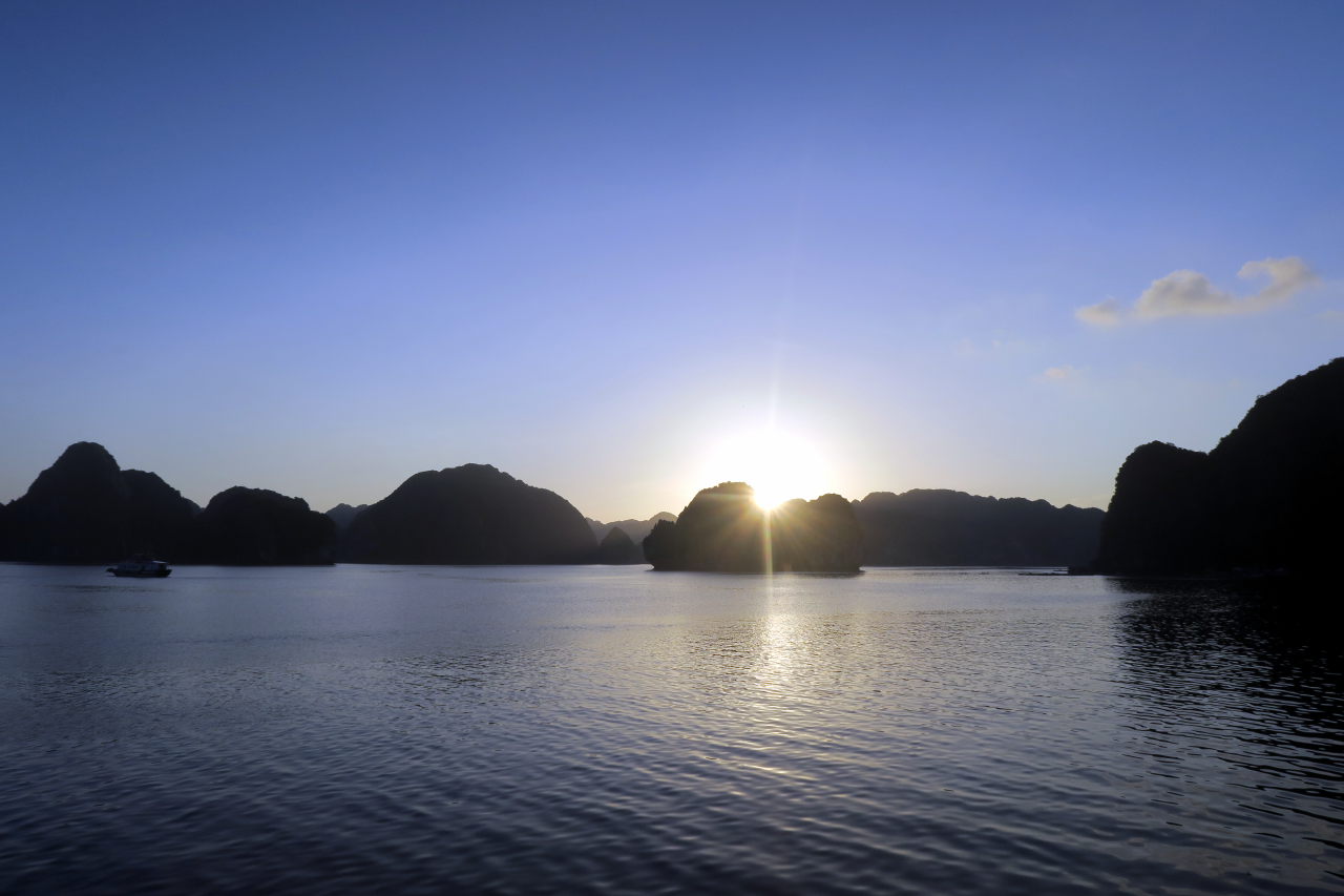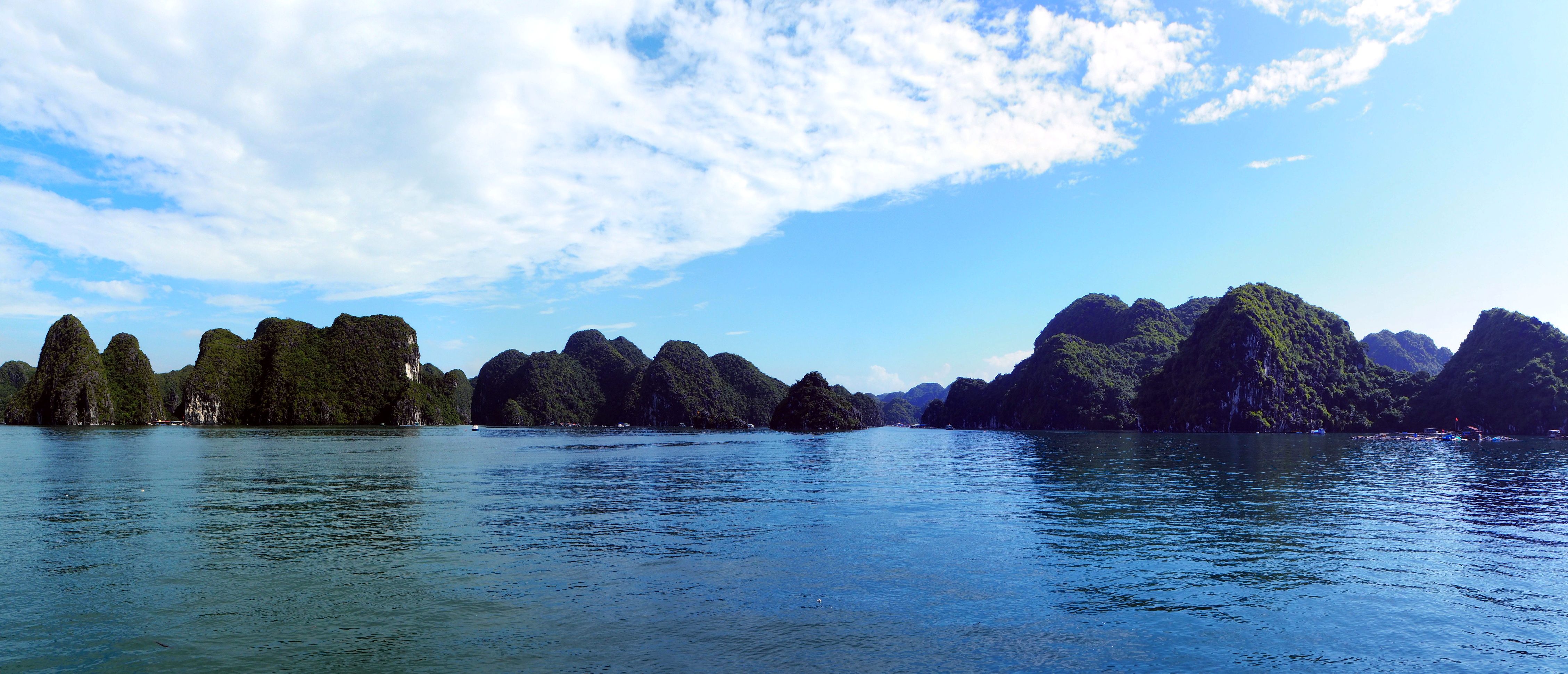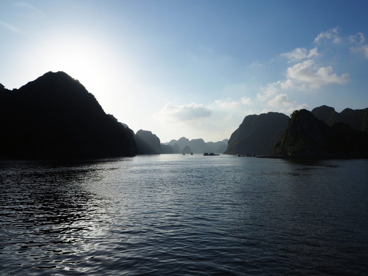 Arrivé dans la baie d’Halong, on distingue au loin les immeubles qui bordent la baie