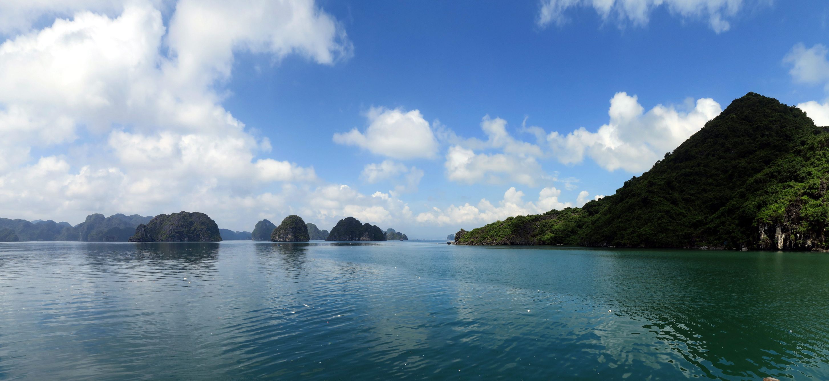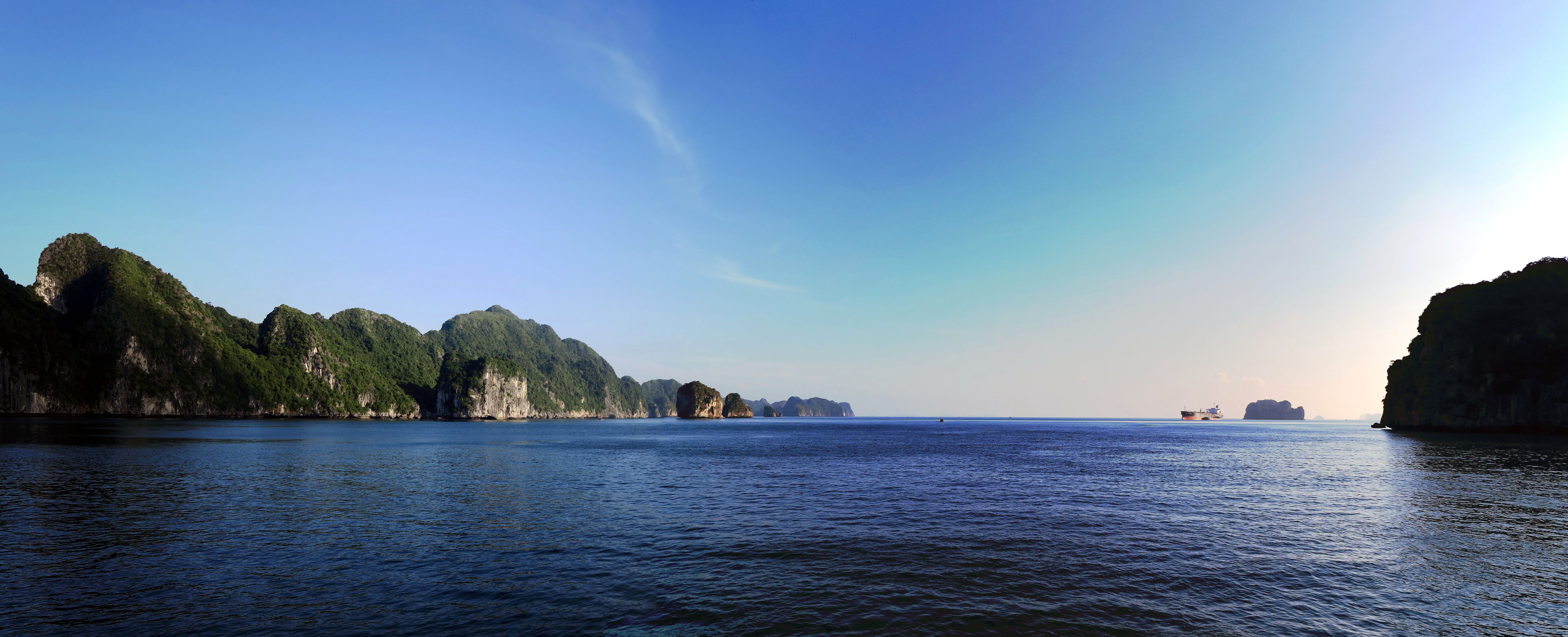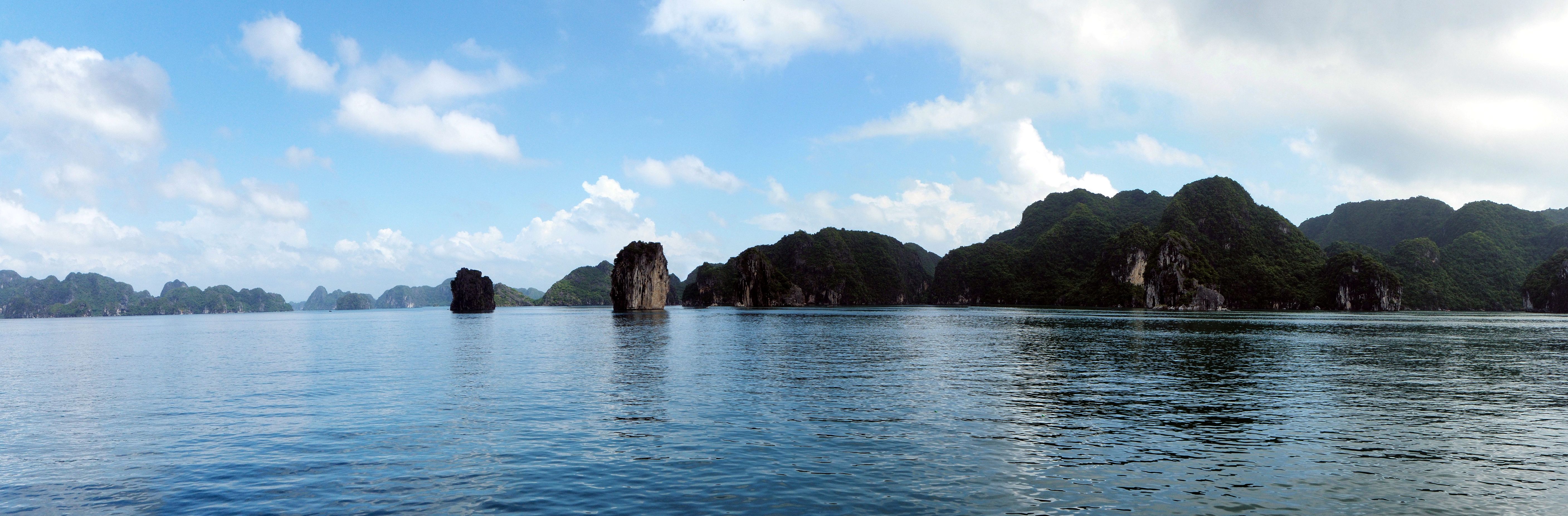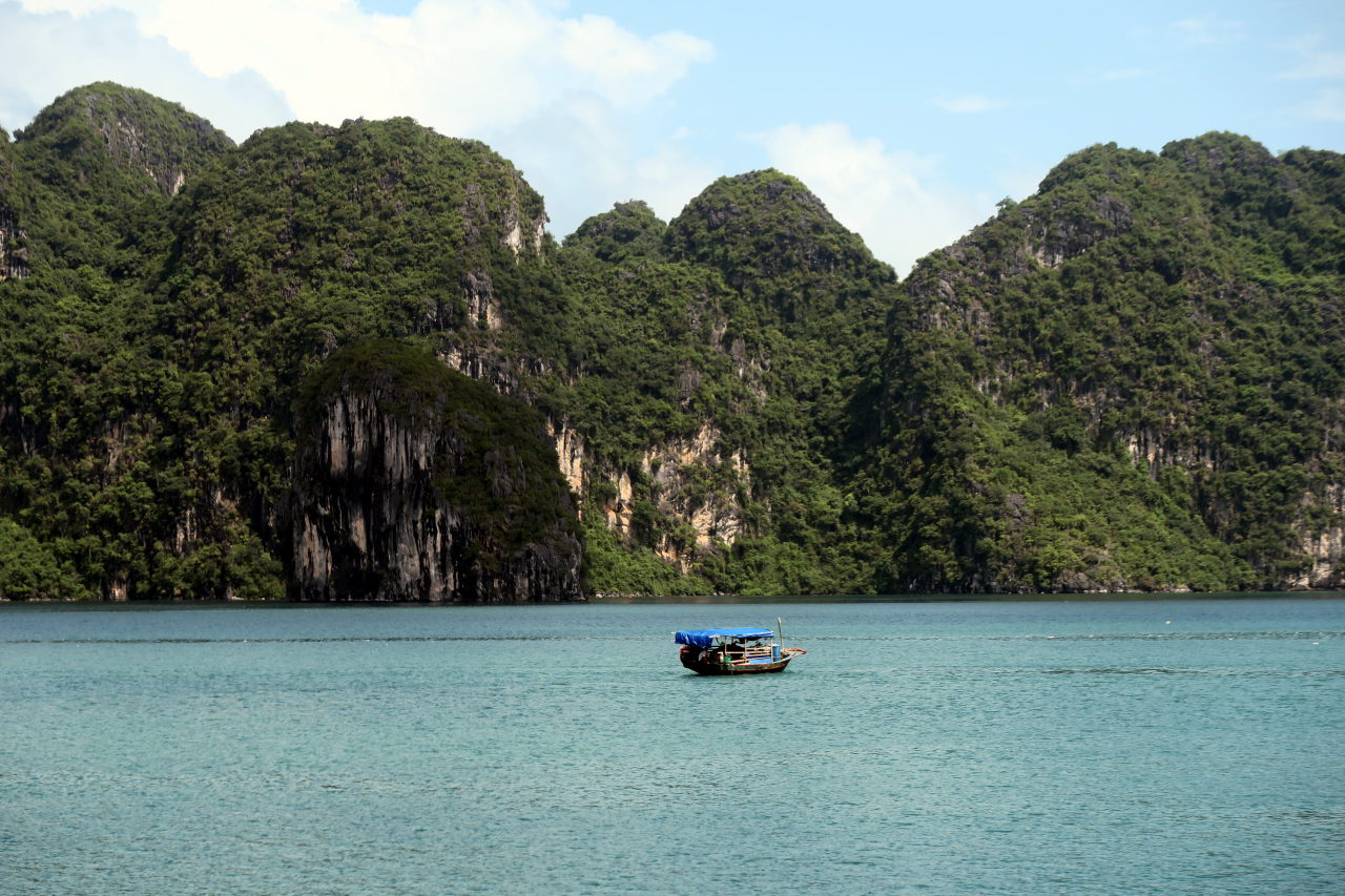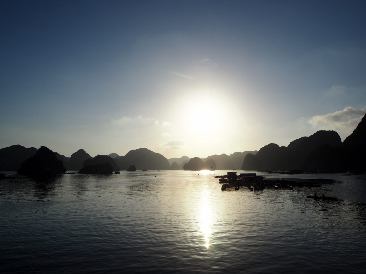 Arrivé dans la baie d’Halong, on distingue au loin les immeubles qui bordent la baie