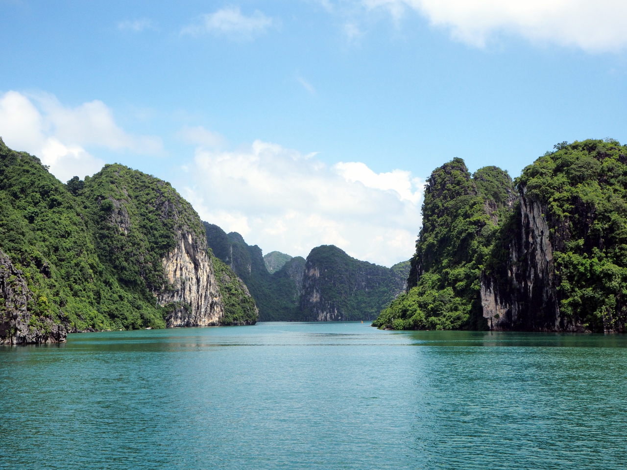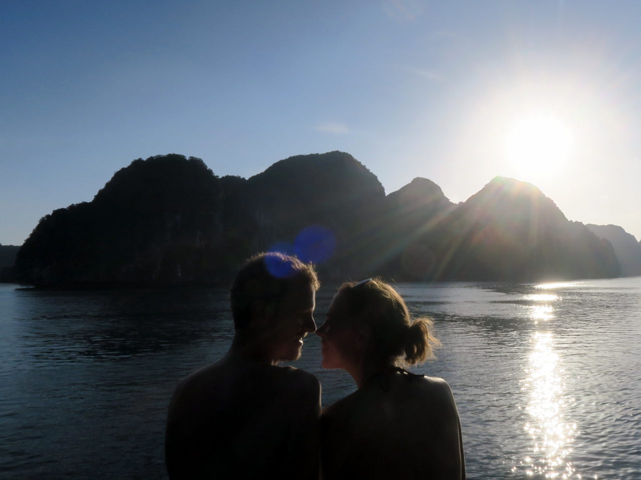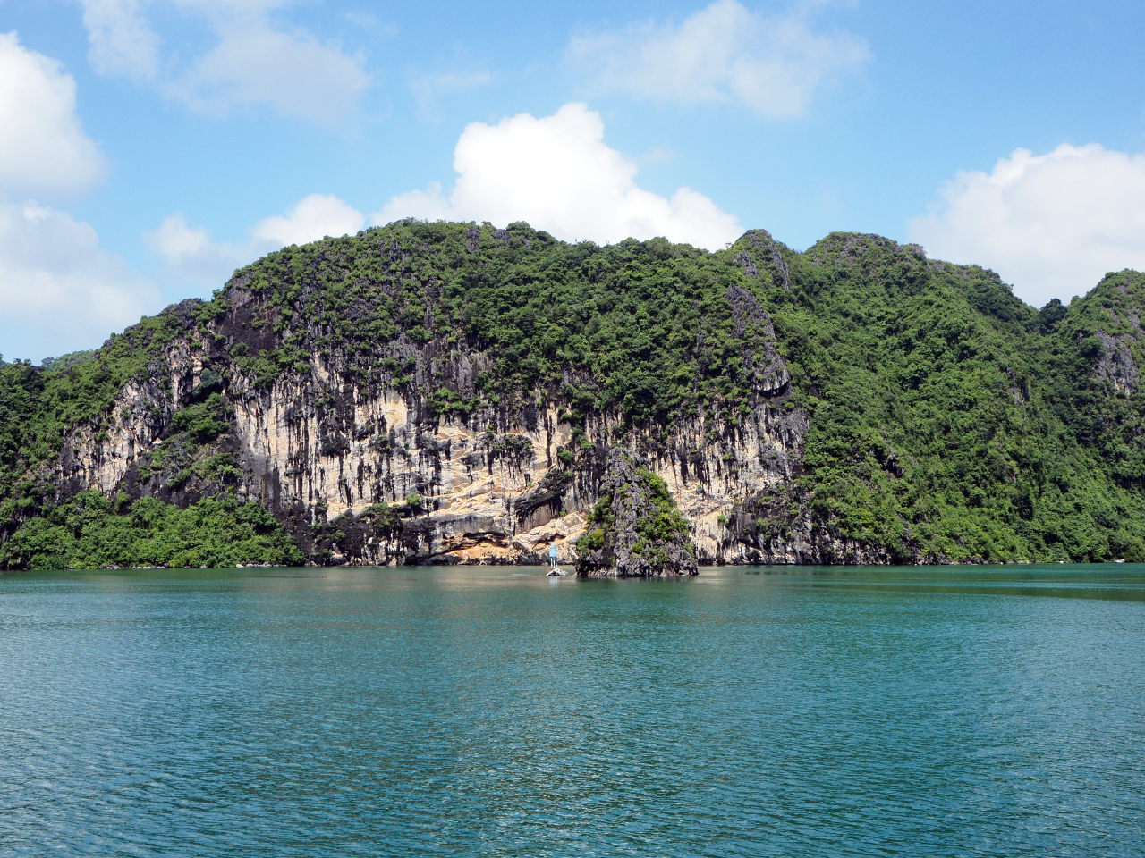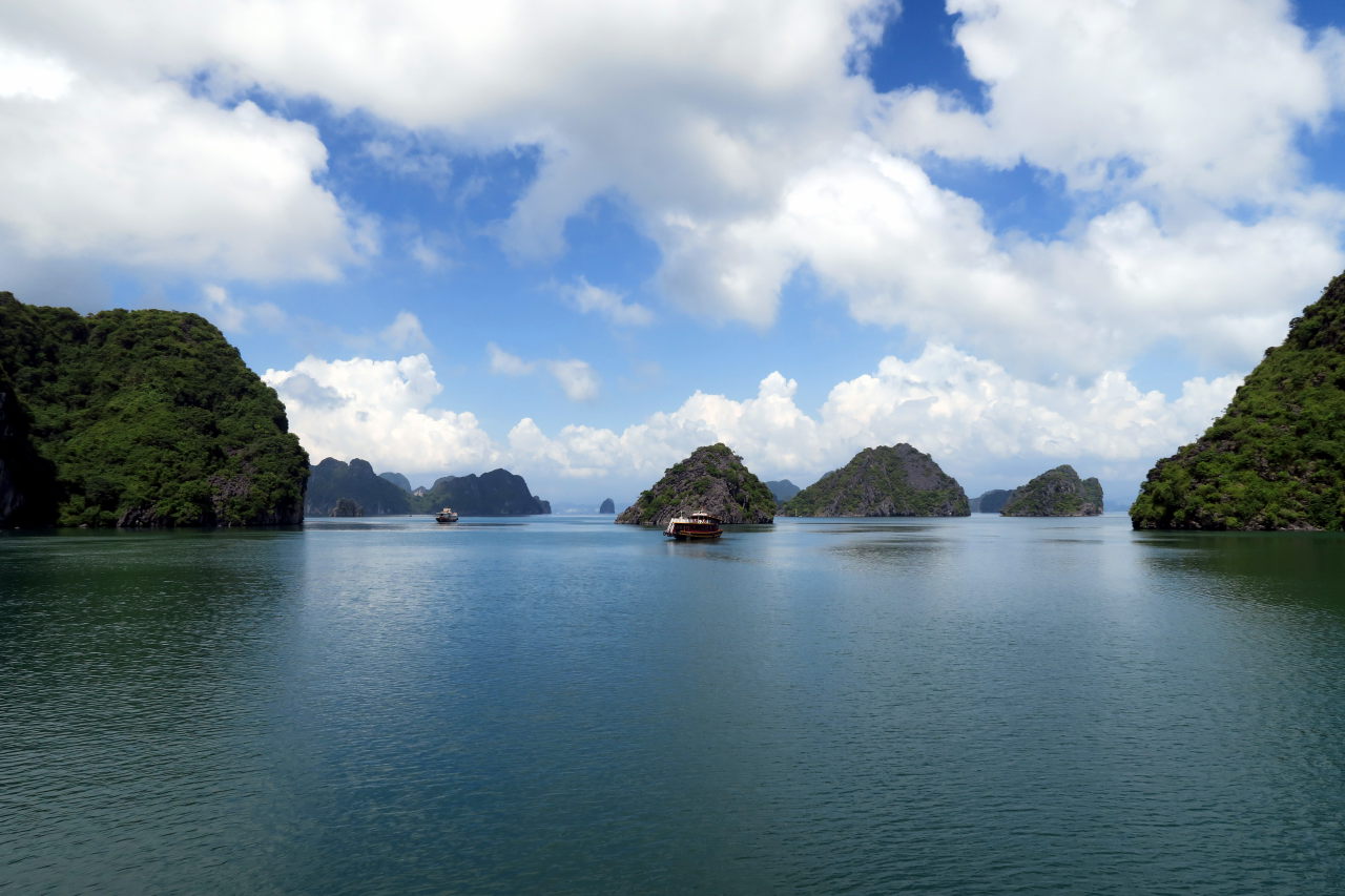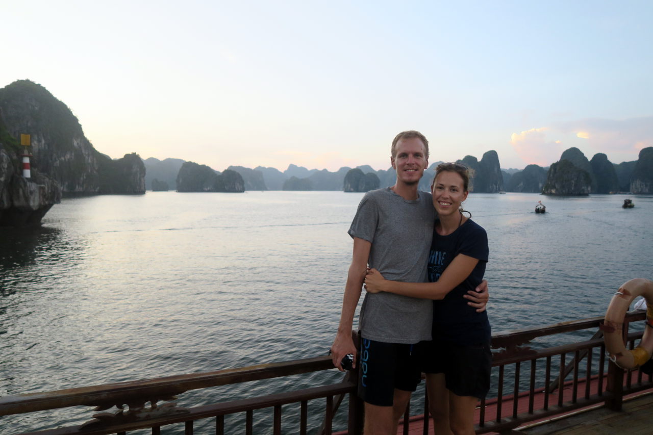 Arrivé dans la baie d’Halong, on distingue au loin les immeubles qui bordent la baie