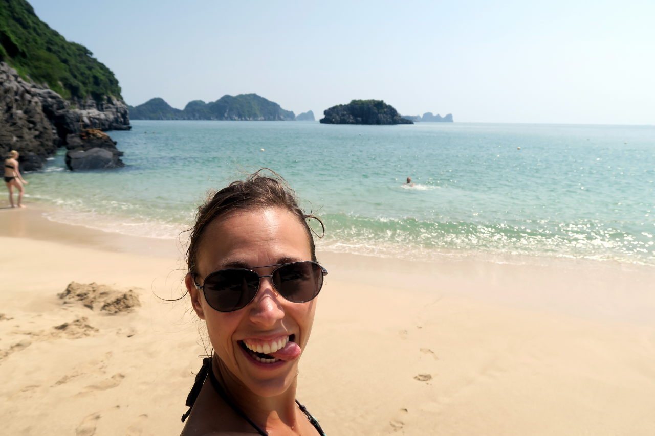 Elise sur la plage à Cat Ba