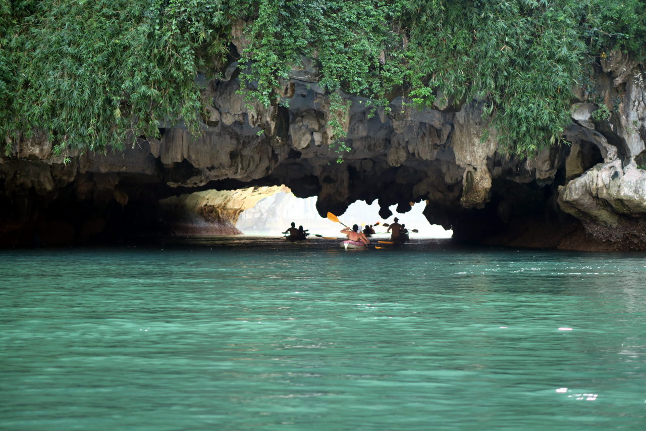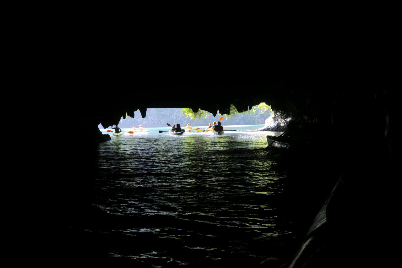 En kayak dans une grotte donnant sur un lagon intérieur