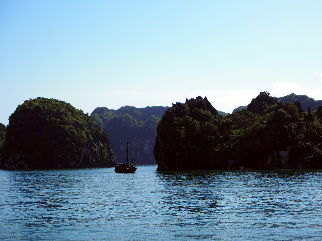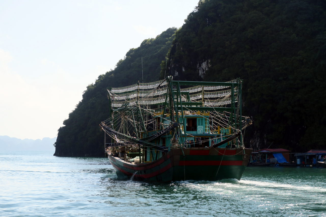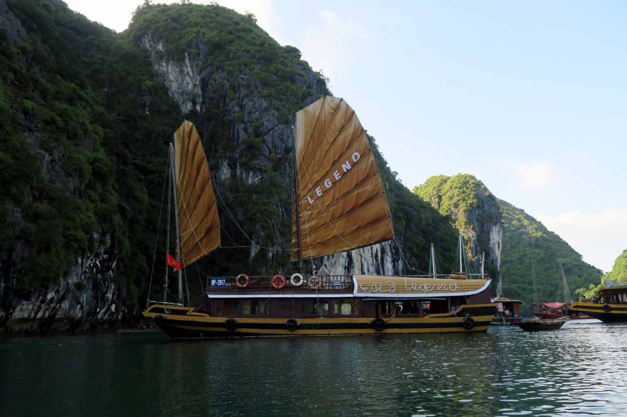 Une jonque traditionnelle, toutes voiles dehors (alors qu’il n’y a aucun vent dans la baie)