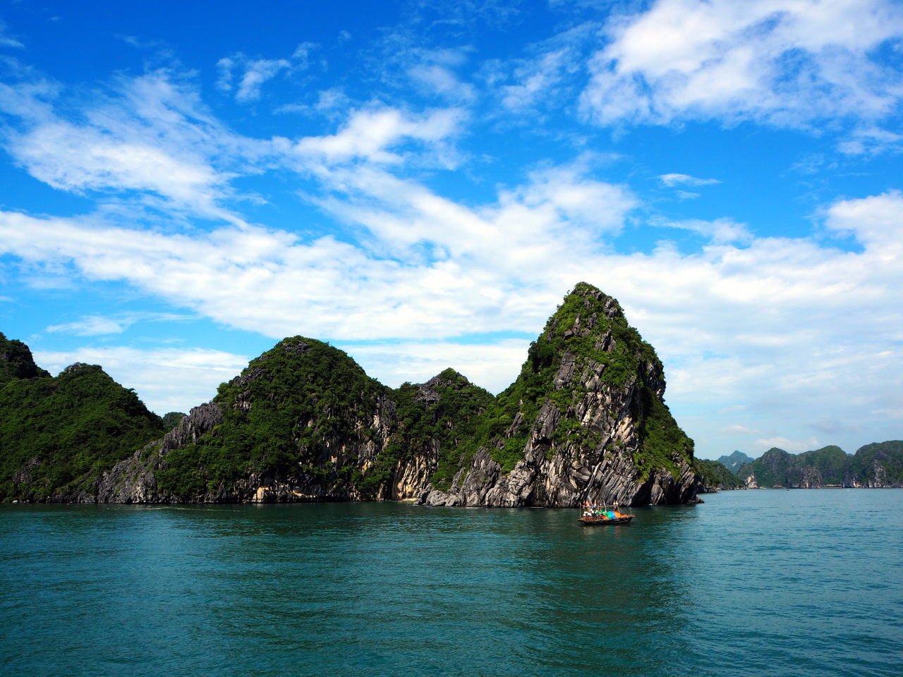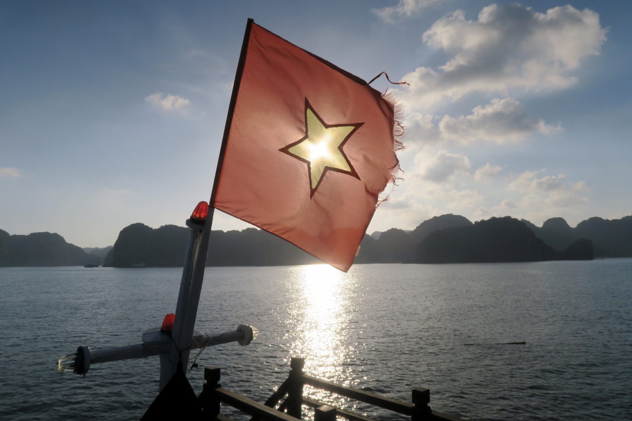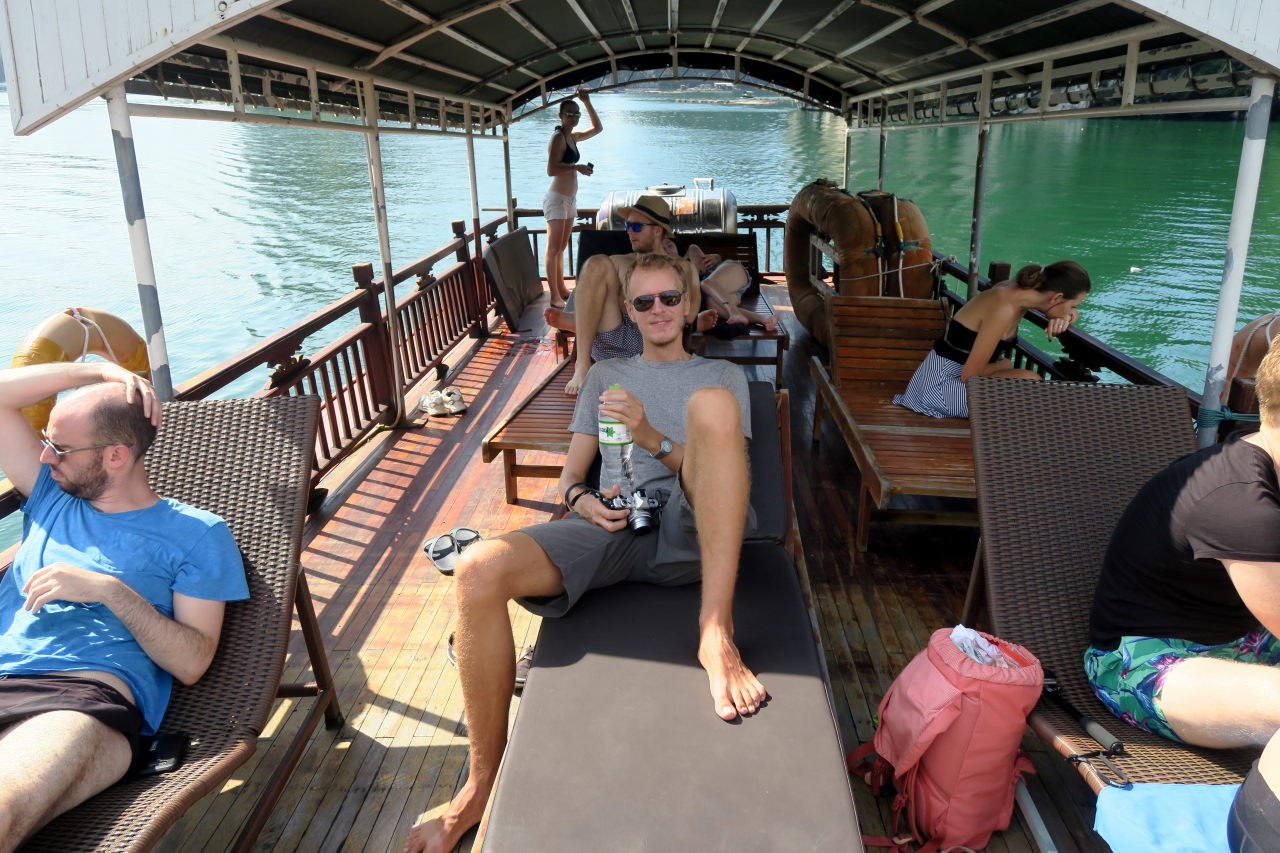 Une jonque traditionnelle, toutes voiles dehors (alors qu’il n’y a aucun vent dans la baie)